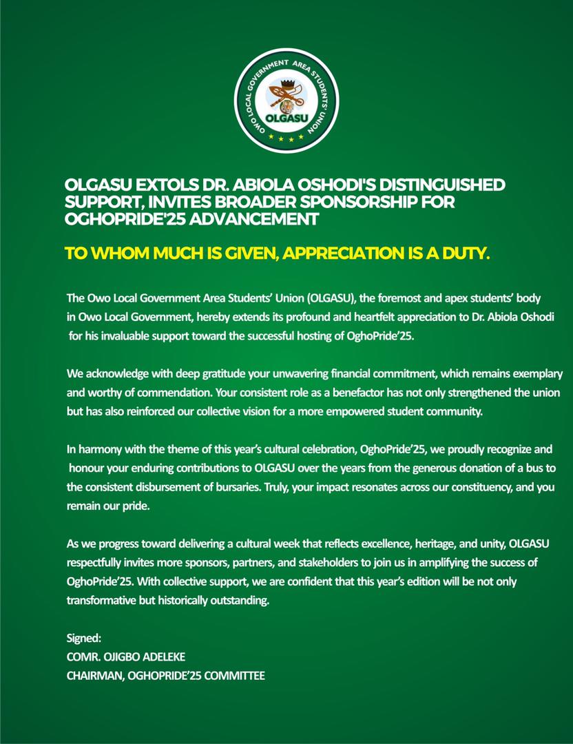 The Owo Local Government Area Students’ Union (OLGASU), the foremost and apex students’ body in Owo Local Government, hereby extends its profound and heartfelt appreciation to Dr. Abiola Oshodi for his invaluable support toward the successful hosting of OghoPride’25.